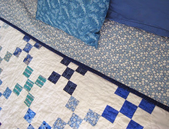 New place to live, blue room, happy Irish Chain quilt.